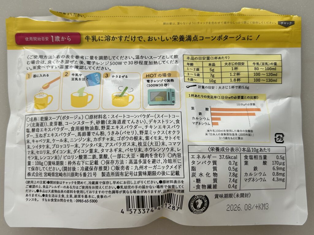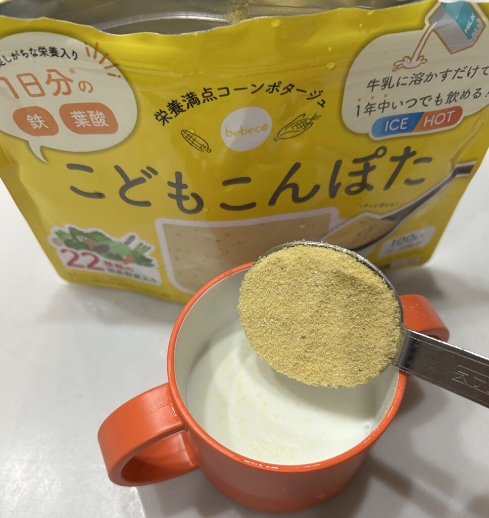 裏面の記載を見ると、我が子は1歳半なので、大さじ一杯に対し、牛乳80〜100ml入れて溶かしました。